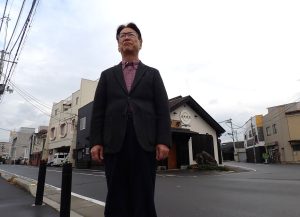 ②あの日の津波で失われた「マメヤ」があった、JR石巻駅前の三叉路に立つ三浦さん=2025年11月26日、筆者撮影