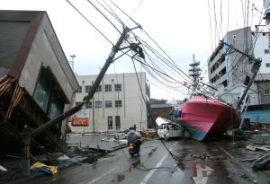 ①震災6日目の石巻市中心部。津波が北上川から街に流れ込み、、多くの船が道をふさいでいた=2011年3月16日、筆者撮影